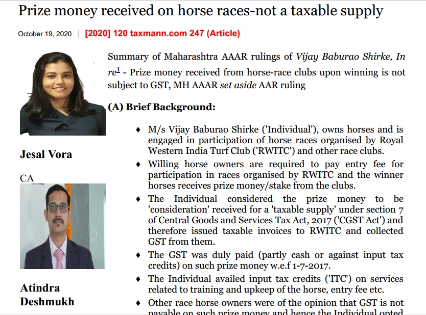 Prize money received on horse races-not a taxable supply